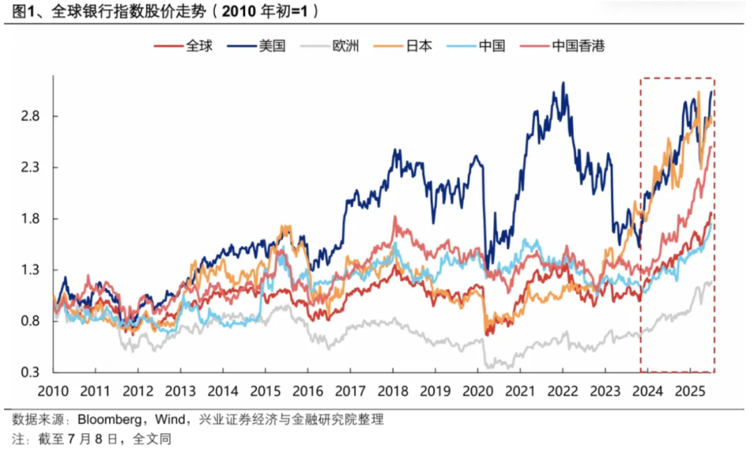 实际上,银行业作为“百业之母”,业绩跟广义货币M2的增速息息相关,具有永续性,在经济换挡期,自然成为香饽饽。不止在中国,在全球都在创新高,相对大盘指数跑出了超额收益。